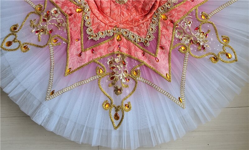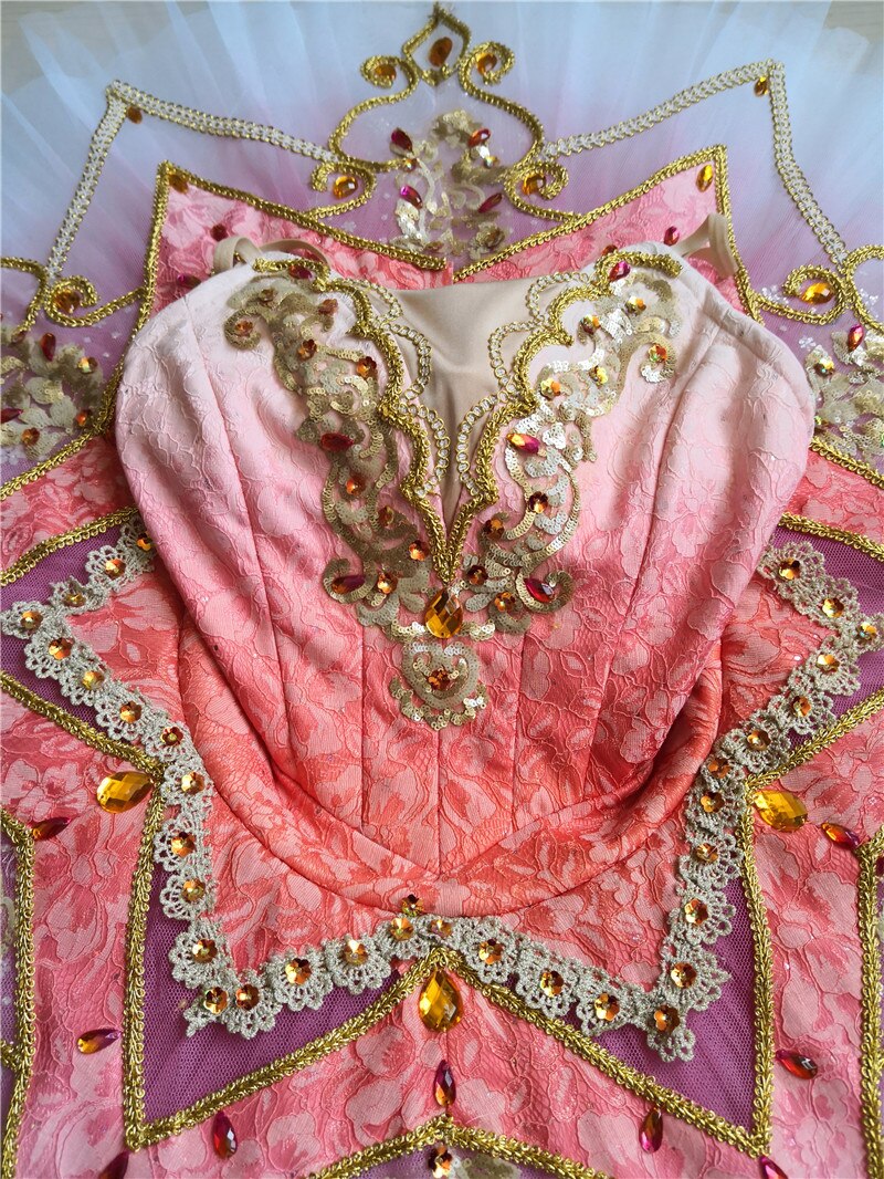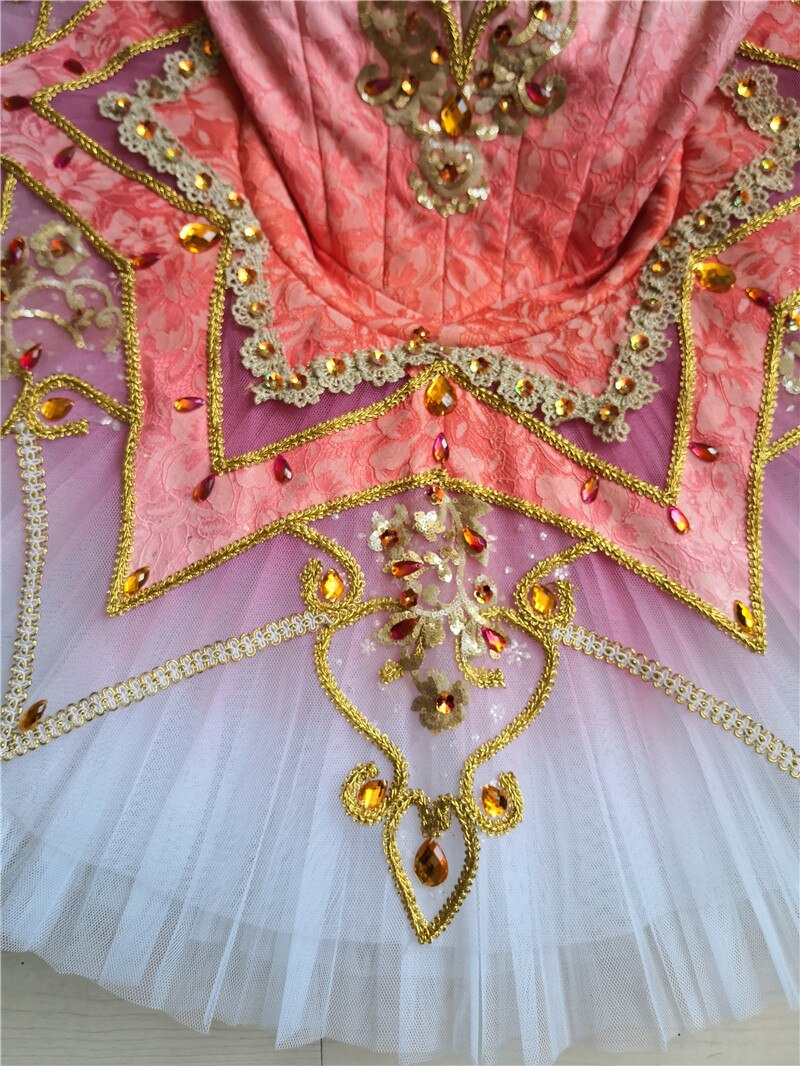 This professional tutu features the ombre' technique. The boice has been dyed in graded shades of pink, and is amde with semi elasticized lace. There is a deep V cut and rich appliques decoration in gold, as well as sequins and crystals. The costume fastens in the back with a double row of hooks and eyes.