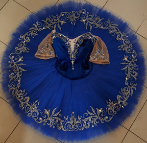 The Russian pancake tutu, with inserted hoop, is also deep blue, and is embellished with silver appliques and crystals all around.