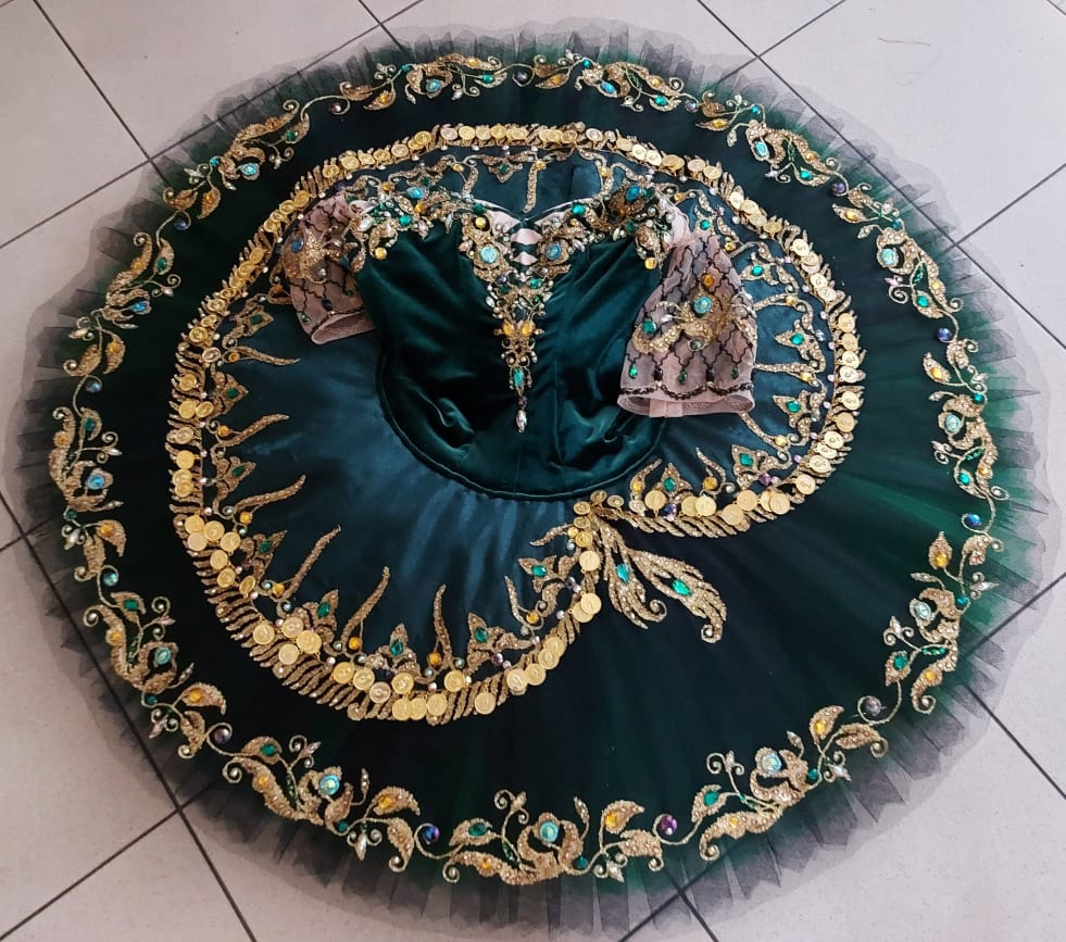 A new Russian professional tutu for the role of Esmeralda, featuring dark green combined with a lot of gold.