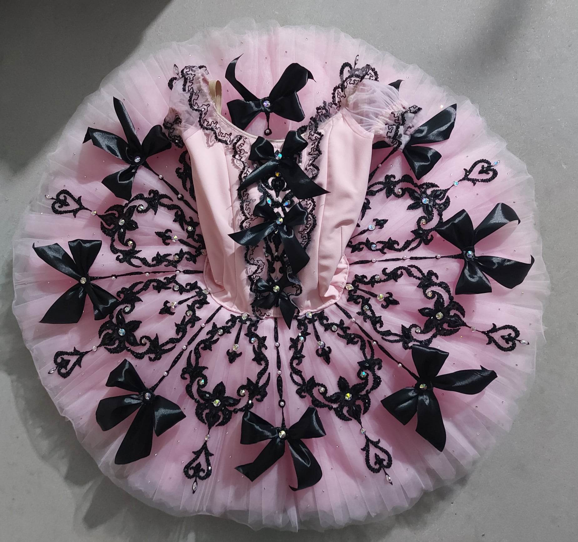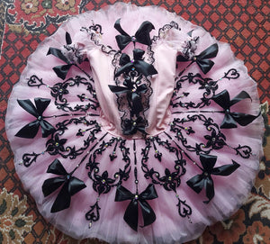 The tutu has 10 layers of hand pleated, graded pink tulle, ruffled panties and inserted hoop. The tutu fastens in the back with a double row of hooks and eyes.