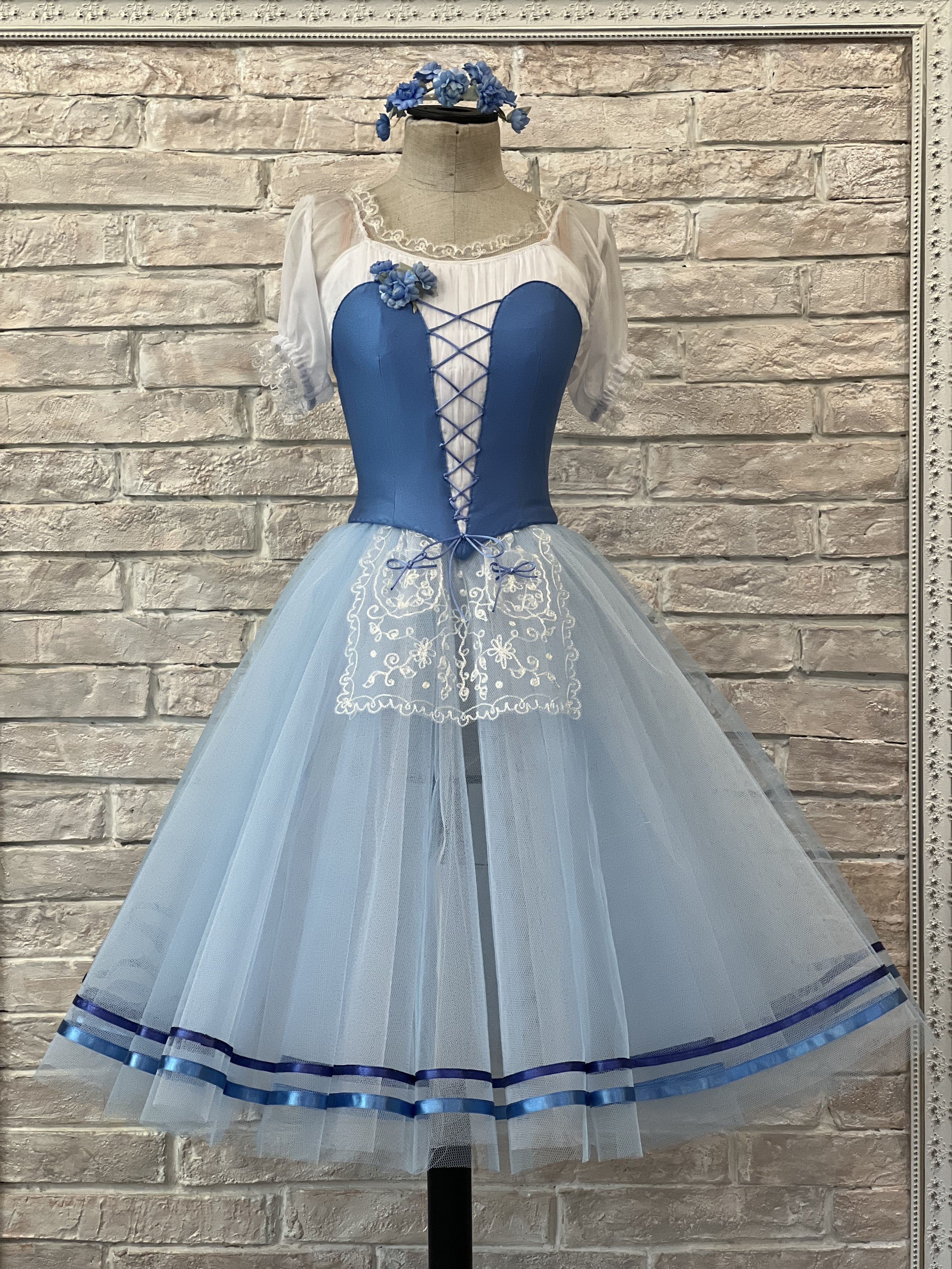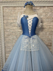 Blue corset with laced pattern and white undershirt and blue flowers decoration. The neckline is decorated with white lace, and the white sleeves are made with high quality chiffon. The Romantic tutu skirt is made with sky blue tulle, and decorated with a lace apron and blue satin ribbons.