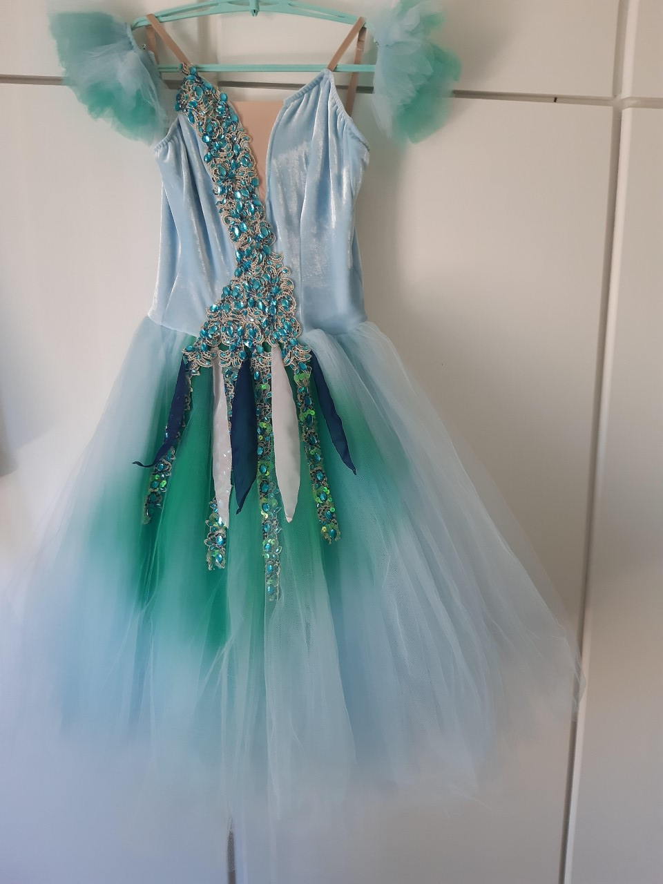 The Romantic tutu skirt is pale blue and has been dyed with the ombre technique, featuring shades of aqua green. The decoration on the skirt is breathtaking: blue and green crystals over chiffon blue and ivory fabric small scarves attached to the skirt.