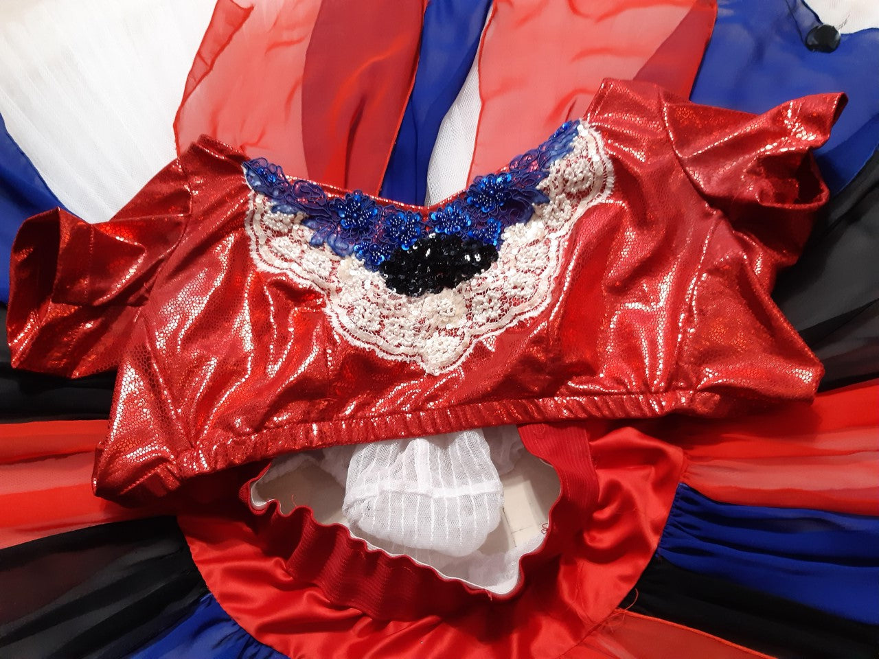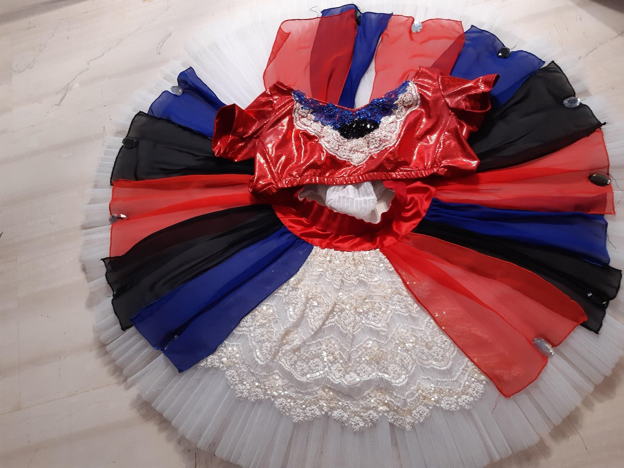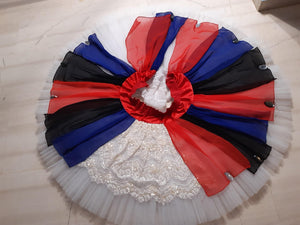 The pancake Russian tutu skirt is white, and entirely decorated with chiffon appliques in red, black and blue, and with ivory lace.