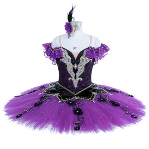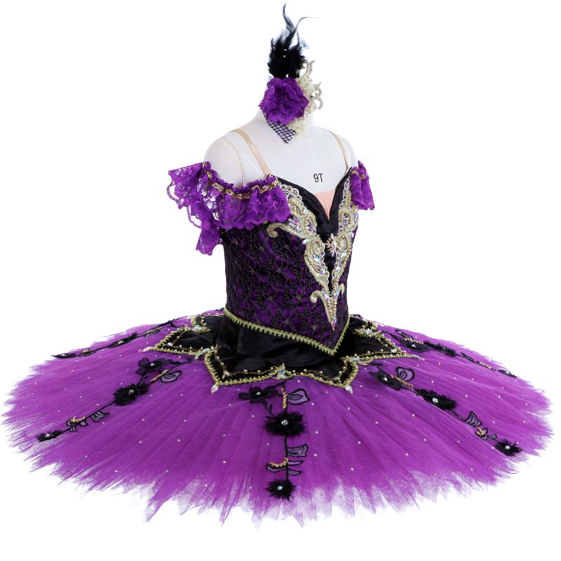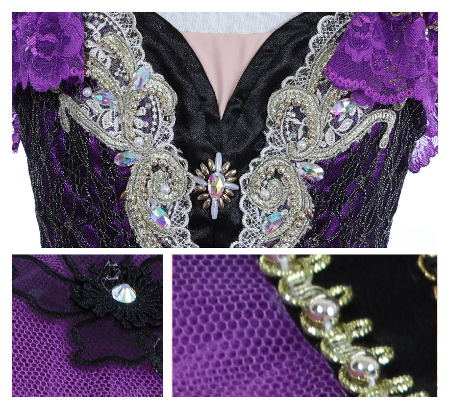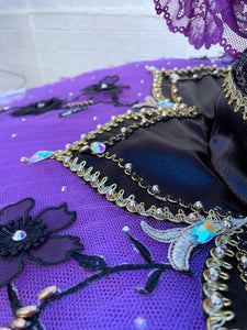 The professional, platter tulle skirt is deep violet, decorated with black flower appliques, silver trims, crystals, and a tiny flower shaped tutu skirt made with black satin.
