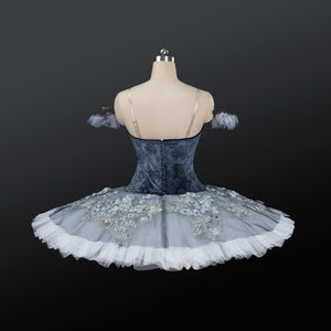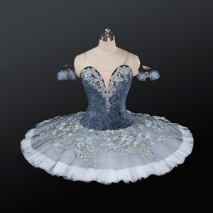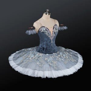 This silver/grey professional tutu is one of the most elegant creations. Suitable for many classical solos like Grand Pas Classique, Sylvia and many others, it features a bodice in shiny grey velvet. Rich grey and silver decorations embellish the bodice, which comes complete with pretty arm bracelets. The professional, 12 layers tutu skirt is white and features a grey overlay embellished with silver and grey flowers, appliques and sparkles.