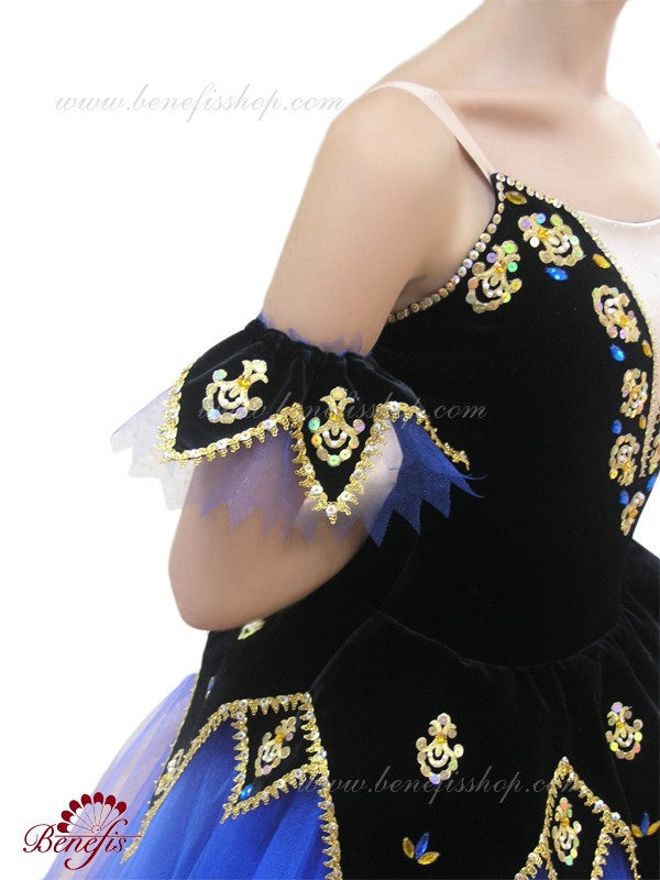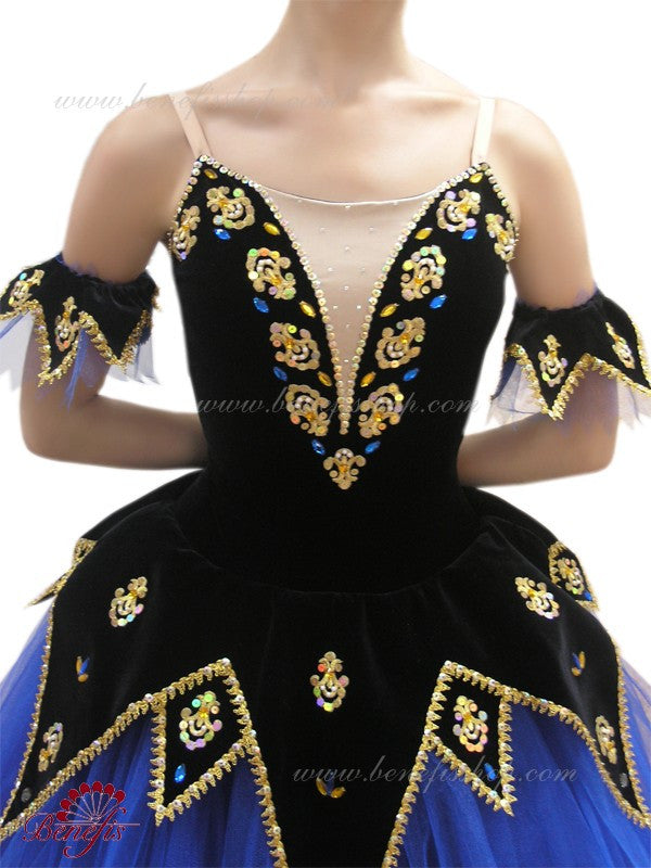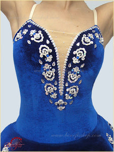 Exquisite applications are used as the costume's décor, along with a big quantity of rock crystals, bugles, beads, and also some added pearls are perfectly harmonize with the royal-blue.