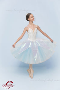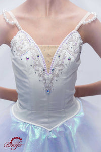 This Romantic tutu is perfect for the Snow Flake scene in the ballet The Nutcracker. This extra shiny professional stage costume combines white and pale blue for a wonderful effect.