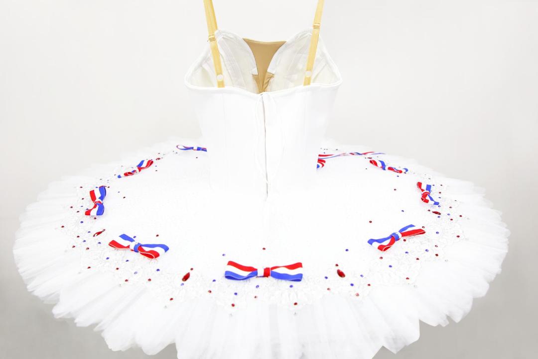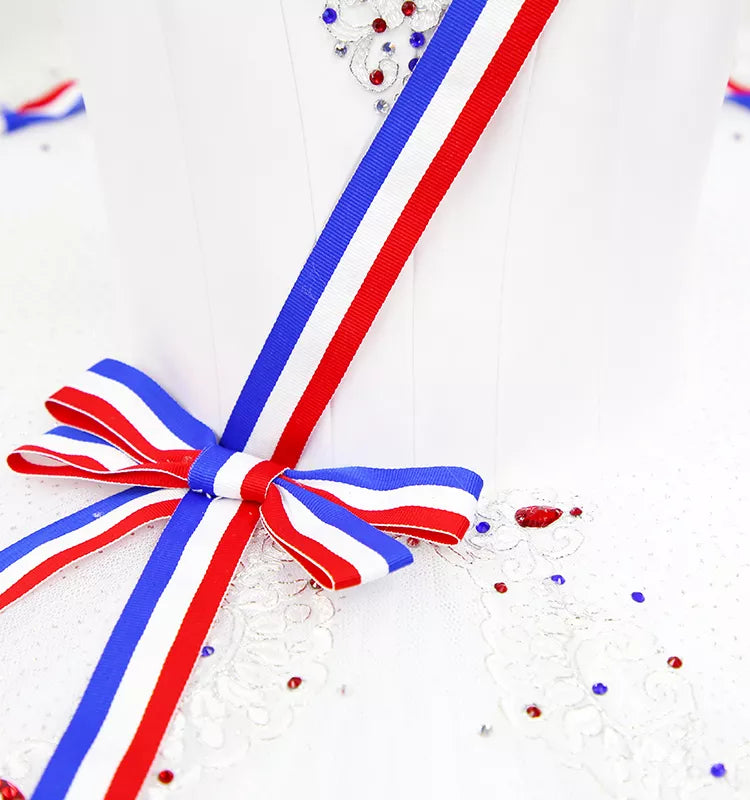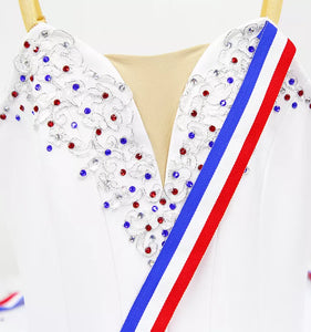 This white, professional pancake tutu features a rich decoration on the bodice, made with red, clear and blue crystals. A long, three color ribbon representing the colors of the French flag, is attached to one shoulder, and decorates both the bodice and the tutu skirt.