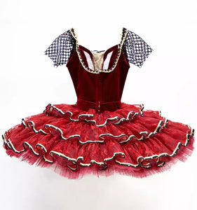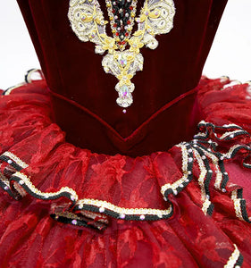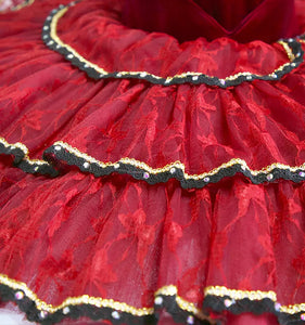 The professional, 10 layers tutu skirt is made with matching red net, and features a frilled red lace overlay with a side opening. Each layer is decorated with black and gold trim and sequins, while a large gold applique' is decorating the side.