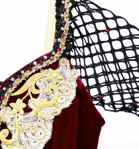 The deep cherry red bodice is made with high quality velvet, and features rich gold appliques, black trims, red and clear crystals, a deep V cut in the front with black laced motif, and adorable black net short sleeves.