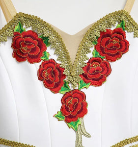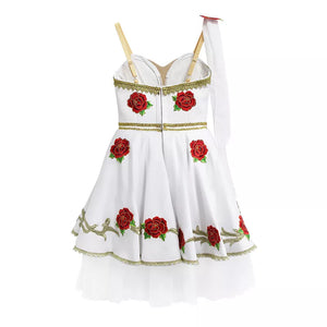 This Romantic tutu is the classical design for this ballet. White bodice with gold trims and red flowers applications. The Romantic white, tulle skirt, is also embellished with red roses appliques.