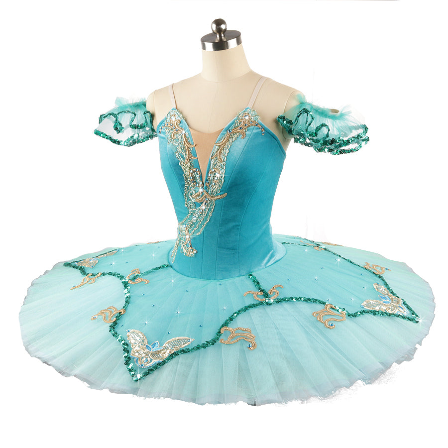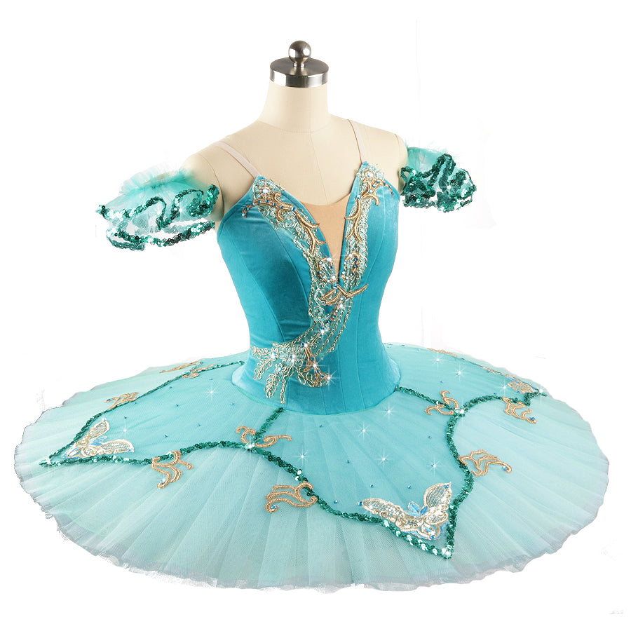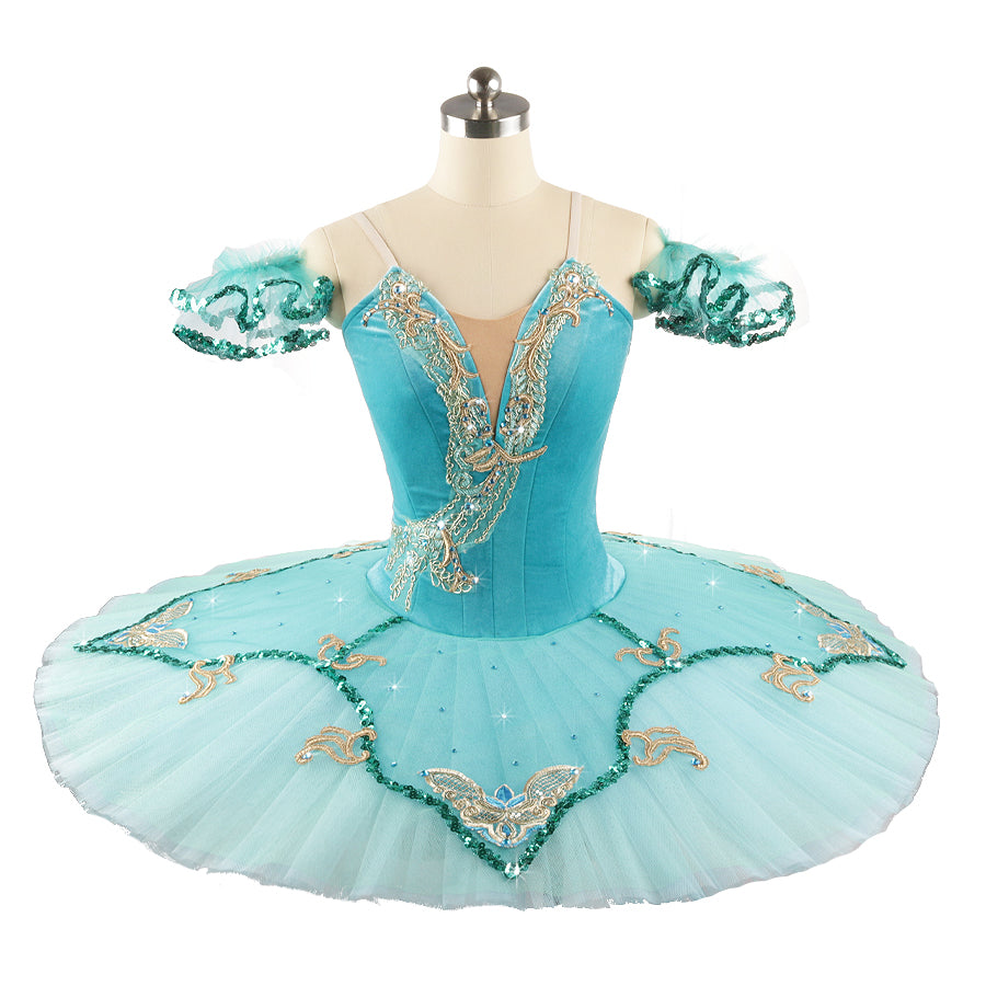 The 10 layers platter skirt matches the bodices, with lighter shades of turquoise, green trims and gold appliques.