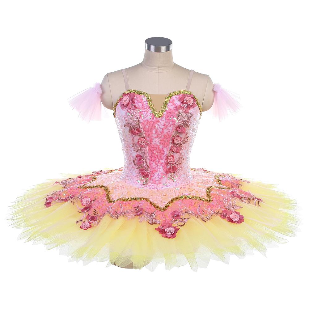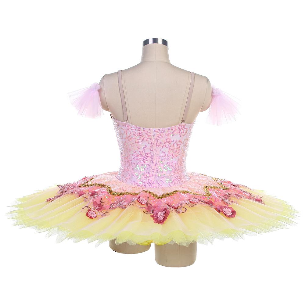 The ten layers, professional tutu skirt is yellow, and boasts a pink sequin tutu skirt to match the bodice. Rich decorations with pink flower appliques, gold trim, pink appliques and sparkles.