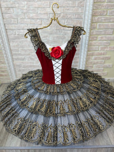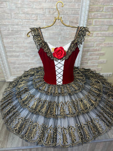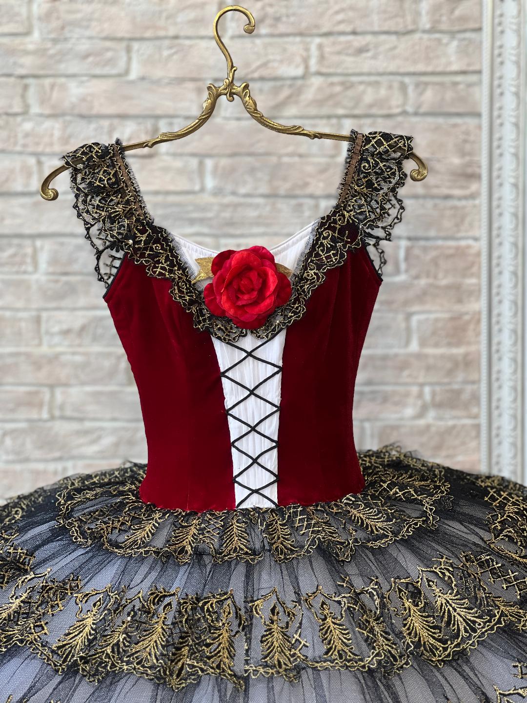 The professional bodice is made with dark red, special semi stretchy fabric. Ivory undershirt and black laced patter. Red rose decoration. The straps are covered with black and gold lace, as well as the neck line.