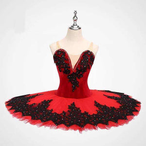 An enchanting Russian creation for the role of Kitri or Paquita. This professional red and black tutu features a red bodice and black shiny decoration. This Spanish costume is all hand tacked and hooped. The tutu skirt features a very original pattern with black lace and black appliques and stones.