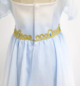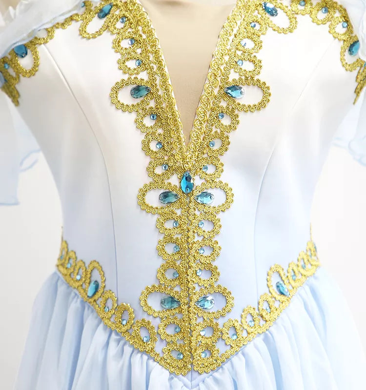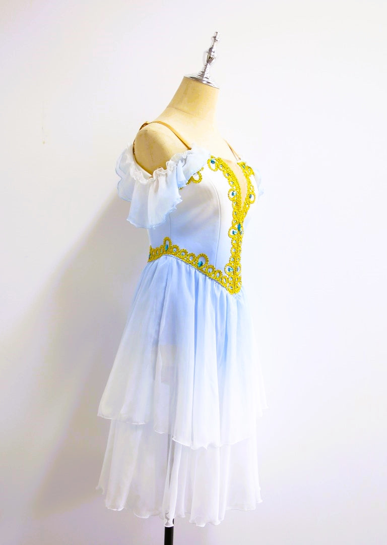 This dress features gradient tones of pale sky blue and rich gold decoration on the top part. Small sleeves are attached to the nude straps.