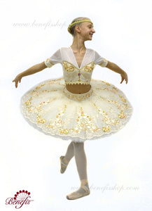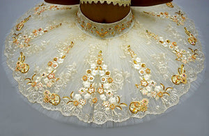 The professional ten layers tutu skirt is entirely decorated in gold.