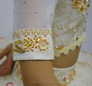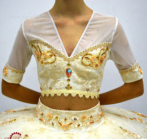 The short bodice, decorated with gold trims and various rhinestones, is made of semi-elastic fabric, covered with guipure, shaped into a thin blouse with netted sleeves. The bodice is fastened with two rows of hooks on the back.