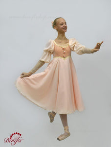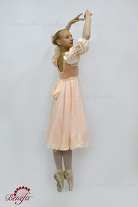 This delicate ballet dress is made of chiffon and thick elastic fabric. The velvet bodice features long sleeves, which are made of two kinds of fabric: chiffon and netting. The bodice is fastened with two rows of hooks and eyes in the back. Decoration includes flowers and braid.