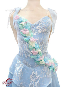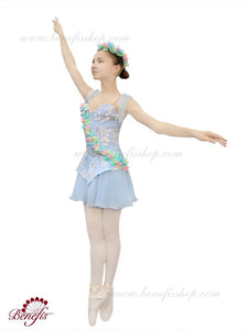 It is a professional stage costume. It is made of dense fabrics doubled with guipure, on elastic straps and is decorated with exquisite applications composed of flowers.
