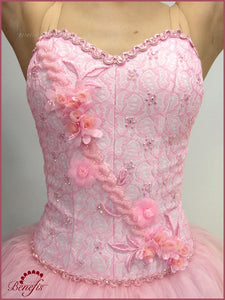 The bodice on the elastic straps is made of two layers of fabric; its surface layer is made of guipure. The bodice is sewn to the romantic tutu with the attached panties.