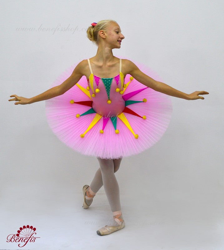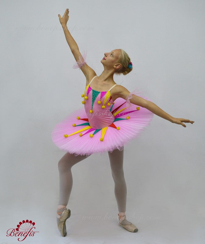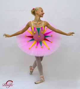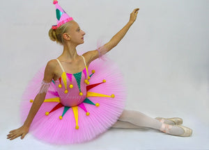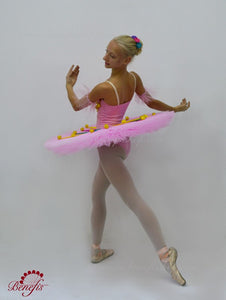 This cute, deep pink pancake tutu features a lycra bodice with yellow, green and pink decorations and pom pons, and a platter pleated tutu skirt.