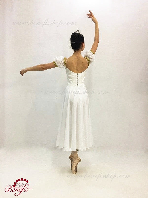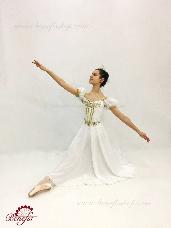 Professional Swan Lake Pas de Trois costume with short sleeves. Semi-stretchy bodice richly decorated in gold, with crystals and sparkles. Hooks and eyes closure in the back. Short puffy sleeves.