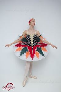 The white, bell-shaped tutu is white, and features an overlay made with different appliques in red, green and orange. The costume looks exactly like the one used by the Bolshoi ballet for this variation.