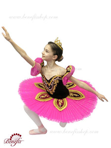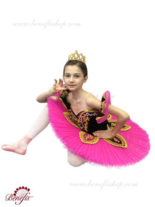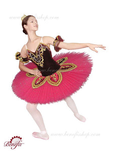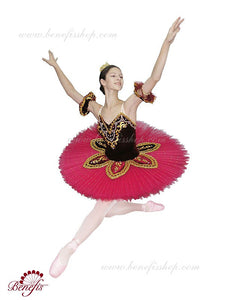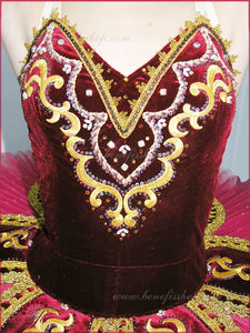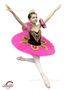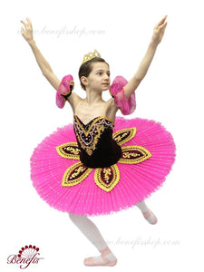 It is a professional stage costume, which is made on the basis of the basic professional tutu. The bodice is made of velvet, on elastic straps, and is decorated with exquisite applications. The bodice has to rows of hooks for comfortable adjustment and an inner cord to tighten the bodice at chest level. The tutu overlay is made of the same fabric as the bodice, in the form of six petals. The upper layer of the tutu is embroidered with bugles. The applications of different colors, crystal, braid, sparkles and pearls impart exclusiveness and originality to the costume. A pair of arm puffs decorated with braids comes along with the costume. This ballet costume can be used for many ballets. It perfectly suits for the "Nutcracker" performance, for the role of the Sugar Plum Fairy.