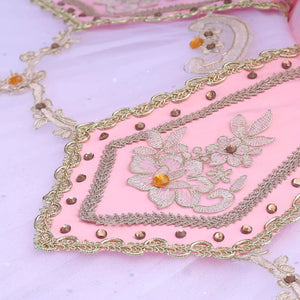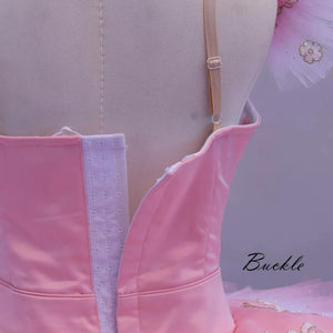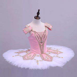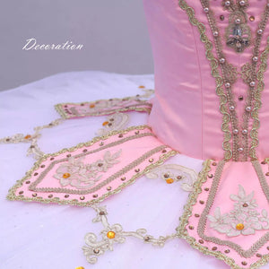 This high quality ballet costume combines classical beauty to comfort. The six piece paneled bodice is made of high quality pink silk fabric, and entirely with exquisite gold decorations, including appliques, sequins, and crystals.  The bodice has elastic straps, hooks and eyes in the back.  The top of the bodice is V shaped, which contributes to elegance in the line.