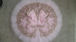 The bodice of this tutu is created with pink brocade, and the nude central insert is richly decorated with gold appliques and trims, Swarovski crystals and sparkles. The three quarter sleeves are the highlight of this costume. The bodice is decorated with antique gold appliques and crystals.