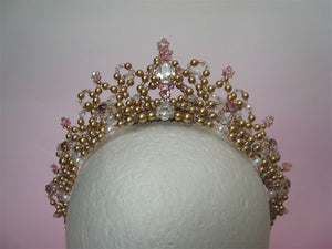 The bodice has been made with peachy pink semi stretchy fabric, and is entirely decorated with gold appliques, crystals and golden beads and pearls.