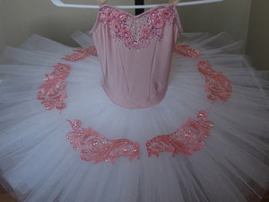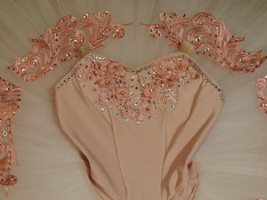 The pink bodice is made with the highest quality pink shiny satin, and is entirely decorated with pink shiny appliques and crystals. The trims and appliques also embellish the back of the bodice, shaping a very elevgant V and lengthening the back of the Dancer. Hooks and eyes closure and matching arm bands.