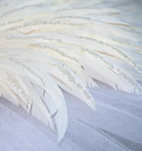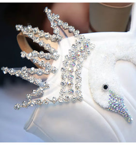 The white, fitted bodice features a unique design, with an embedded white swan to decorate the whole bodice. A miniature diamond princess crown is also decorating the top of the tutu bodice. The pancake, ten layers tutu skirt features decorations made with real white swan feathers, white appliques, crystal, sequins and sparkles.