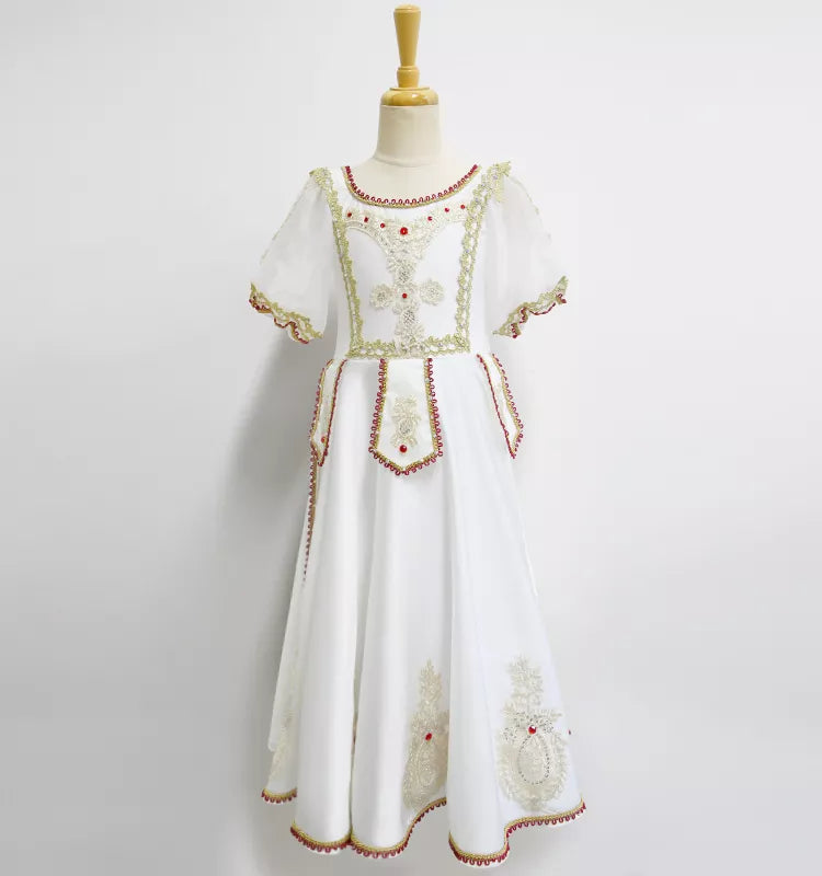 This ivory dress is decorated with gold and dress appliques, sequins and crystals.