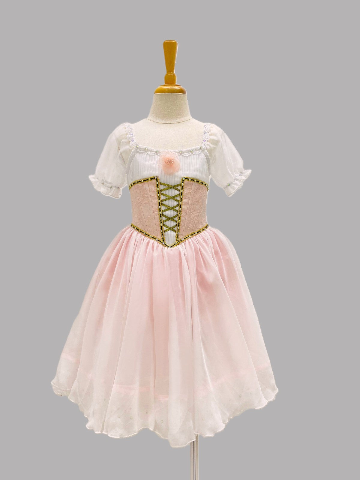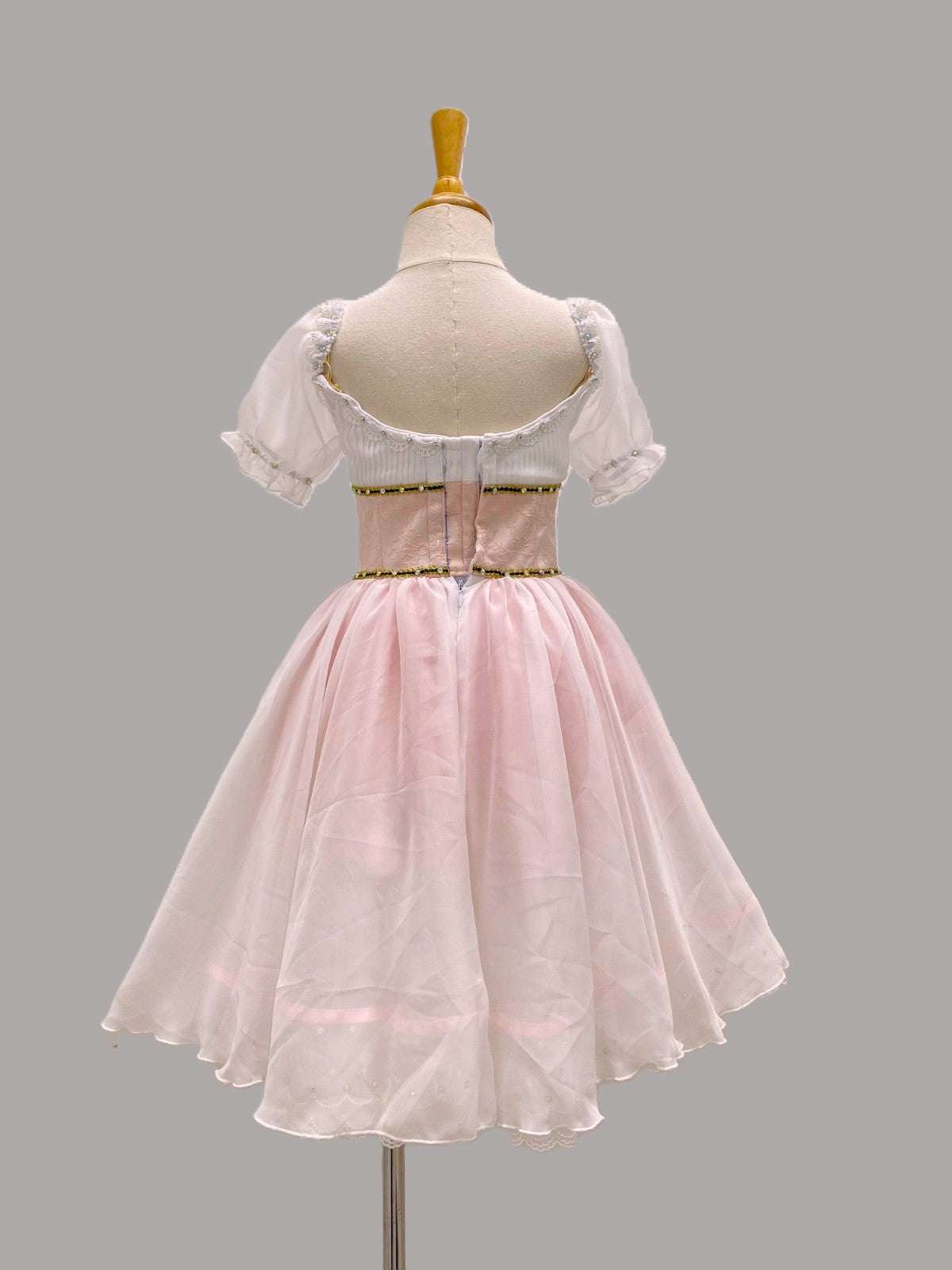 The lower part of the bodice is made with pale pink brocade and features the traditional lacing in the front and a white under-shirt to complete the sweet, feminine doll-style look of Swanilda. Organza white short sleeves decorated with white lace. A pink silk flower is sewn in the center of the bodice's round neck.