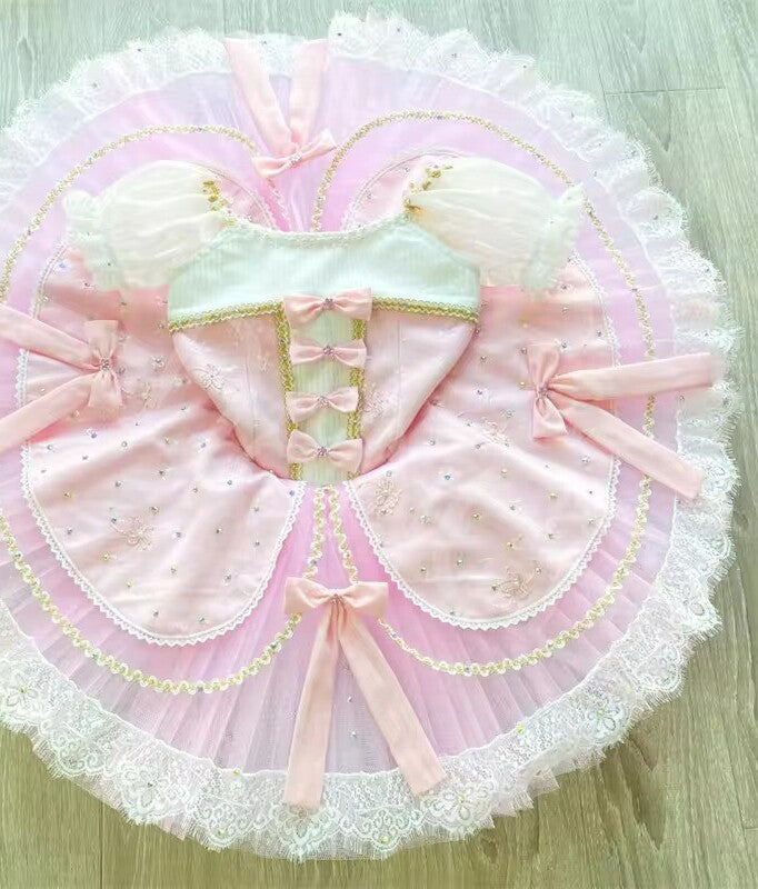 The pink, ten layers professional platter skirt is pink, decorated with a pink overlay made of the same fabric used for the bodice. Beautiful decoration with pink bows and white lace.