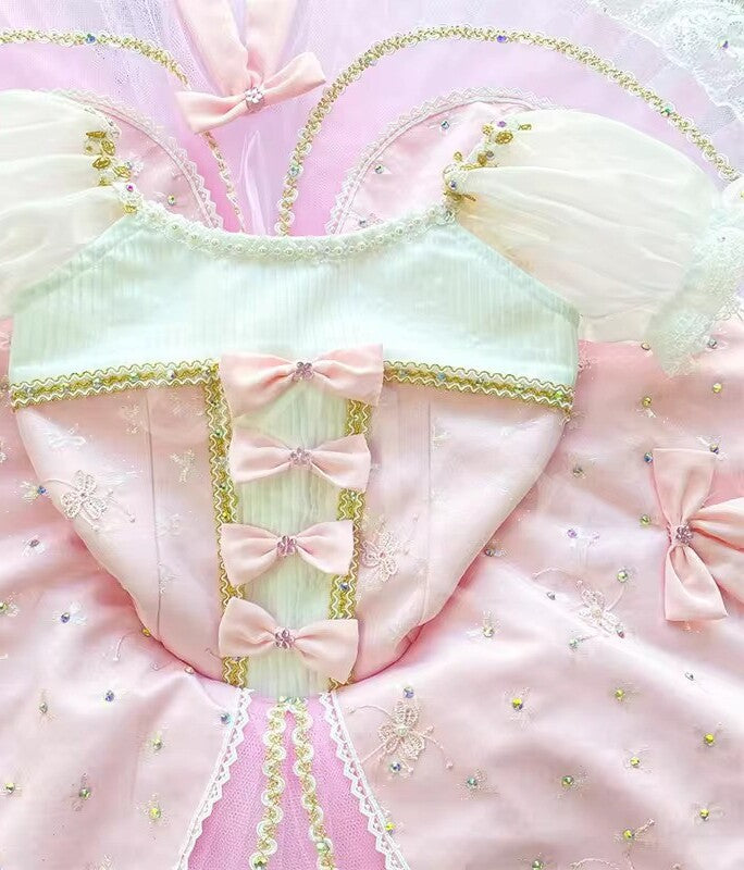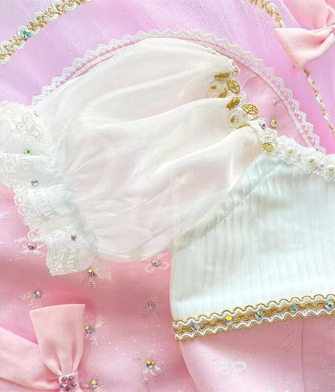 Pink bodice with white pleated undershirt, golden trims and decoration with pink bows. Round neck and white gauze balloon short sleeves. Hooks and eyes closure.
