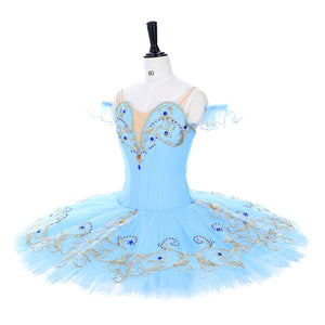 The professional skirt has being made with high quality aqua blue tulle. Rich decorations in gold and blue are scattered on the skirt.