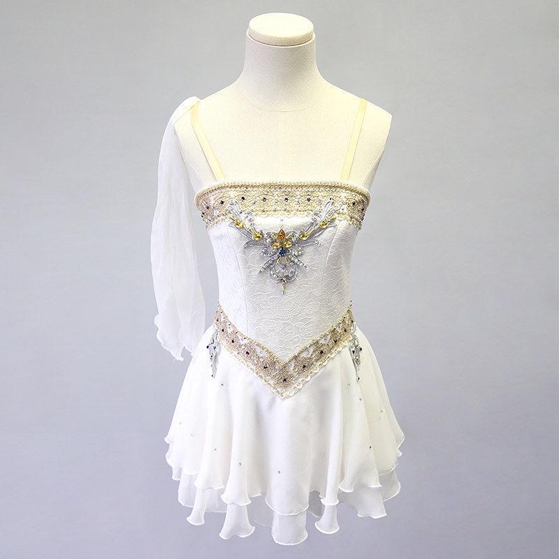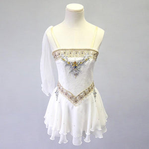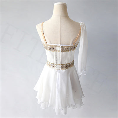 This professional costume features a beautiful top made of crepe fabric, with square neck and rich gold decoration on the top, central and waist area. A white chiffon scarf is attached to one of the nude straps. The two layered white, chiffon skirt features two different lengths.