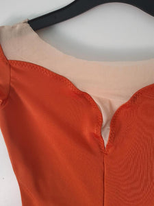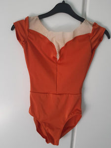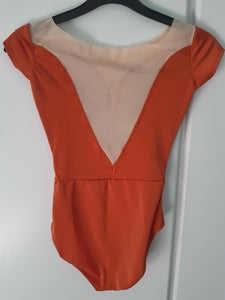 "Terracotta" is one of our latest leotards, in a lovely shade of rusty orange. This elegant lycra leotard features a V neck with nude mesh insert, mesh short sleeves with matching lycra accents, and a deep V shaped mesh back.