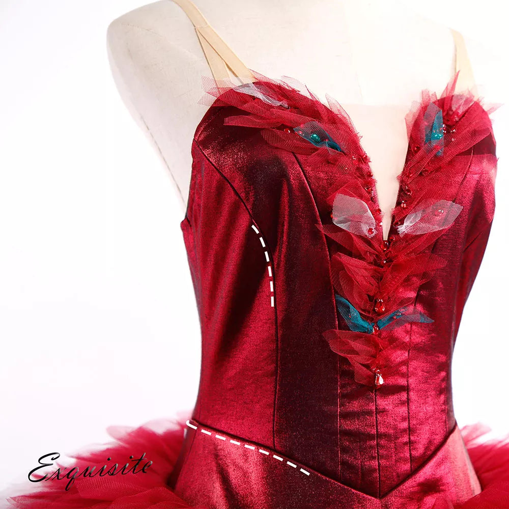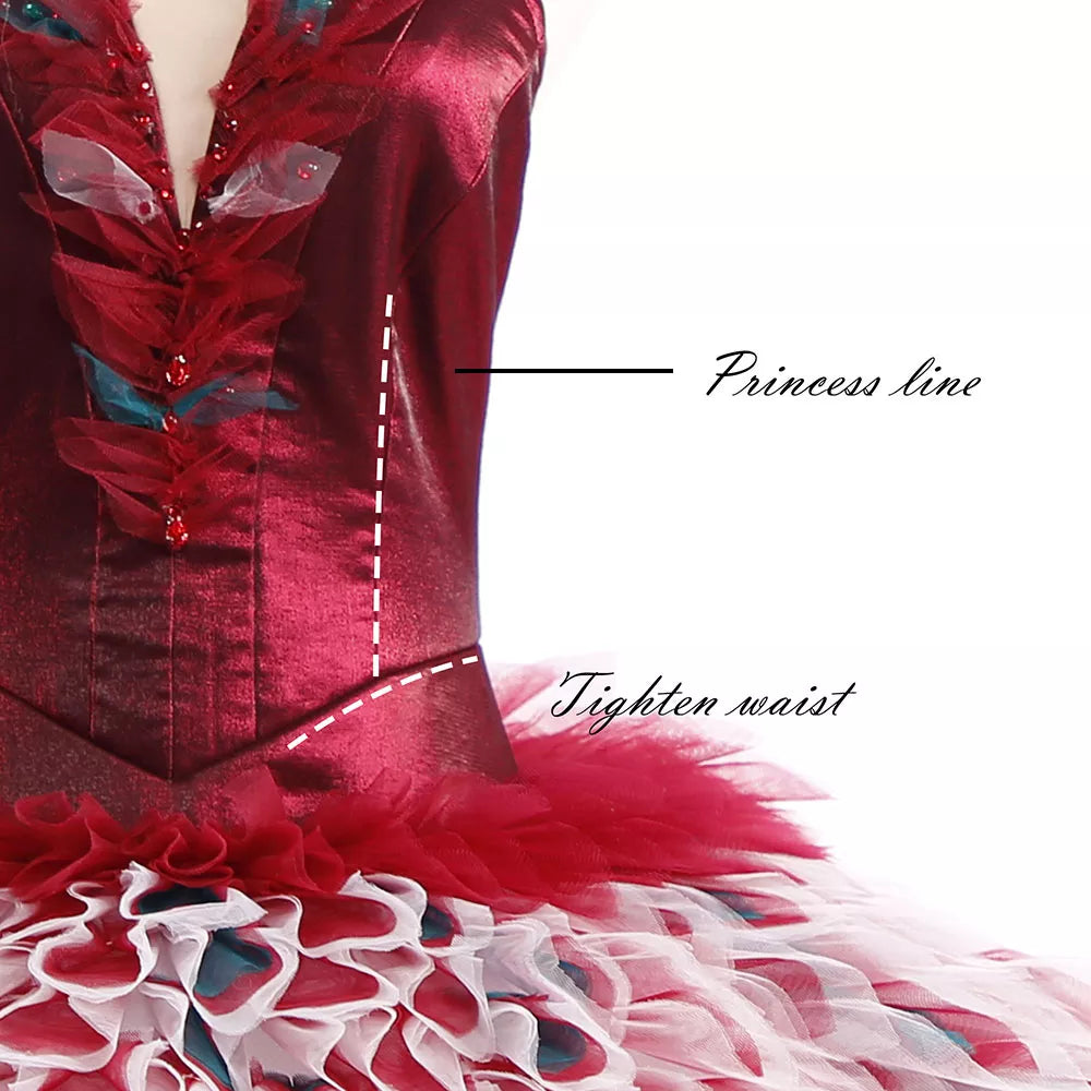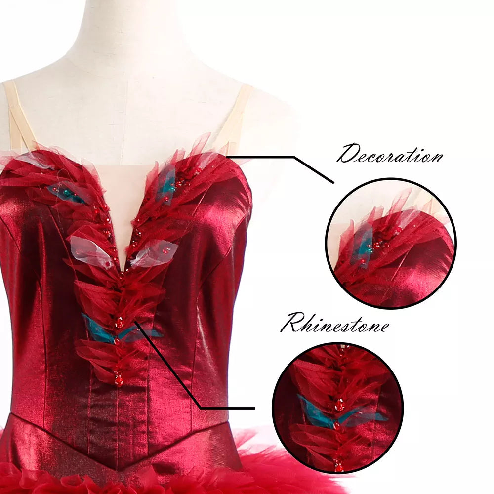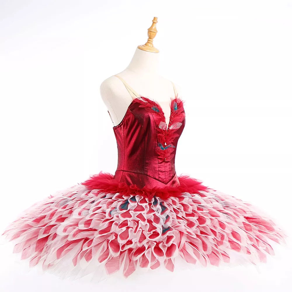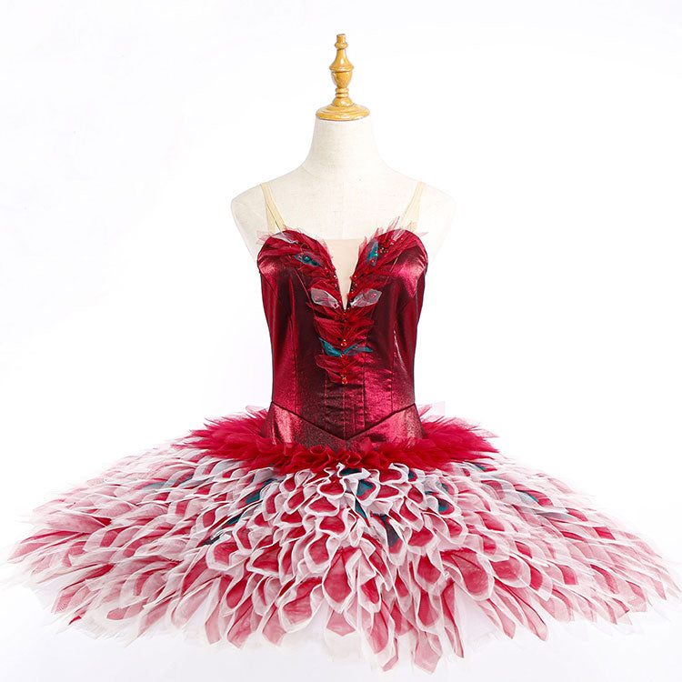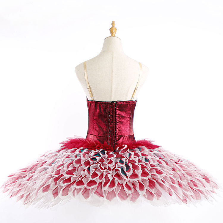 This professional tutu features a shiny dep cherry red bodice, with rich decoration made with red, green, and white real feathers.