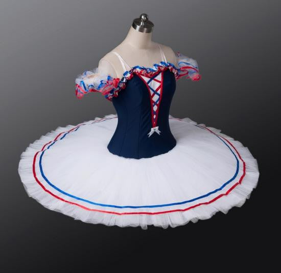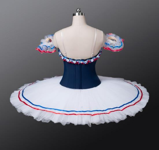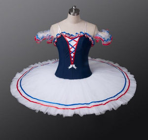 It is created for the ballet "The Flames of Paris". The tight fitted bodice is white and has a central big, V shaped pattern, made with blue, red and white ribbons, representing the French flag. A red, white and blue big bow is also decorates the costume's round neck. White arm bracelets with blue and red ribbons are included.