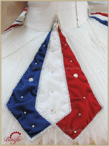 On the top layer of the skirt can be observed 5 crepe-chiffon applications in the shape of rhombs in the color of French flag. The skirt is embellished with crystals and bugles.