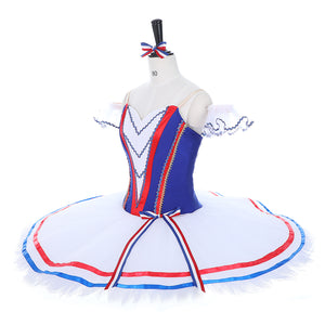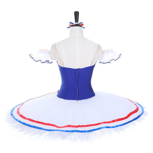 This tutu is created in the traditional French style that suits this ballet. The bodice of the tutu features a sky blue and red corset with a white insert decorated with blue trims.