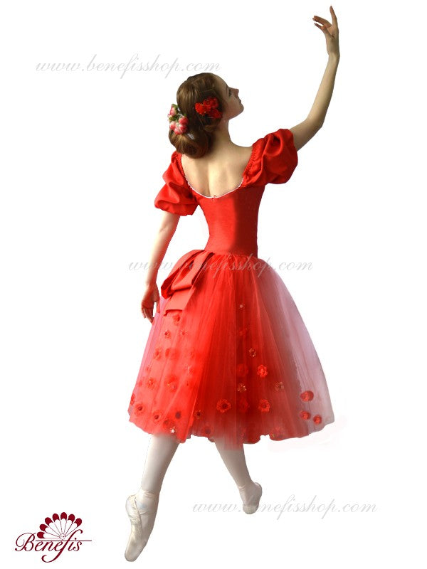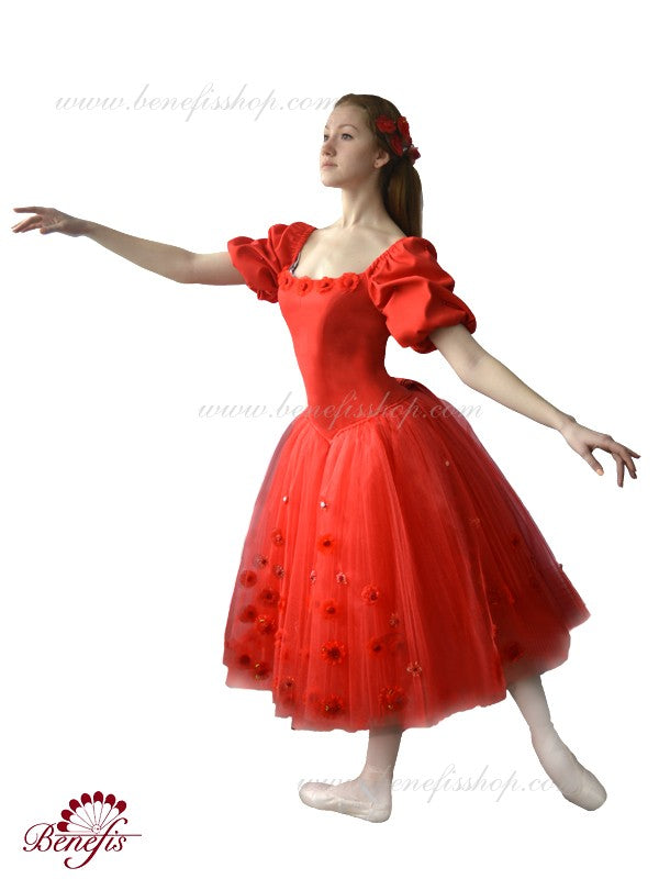 Romantic dress created for the role of Marguerite, in the ballet The Lady of the Camelias. Red taffetas bodice with square neck and puffy three quarter sleeves. Red flowers decorate the top of the bodice. The Romantic, red tutu skirt is made with soft tulle and features a red satin bow in the back. Red flower appliques are scattered throughout the tutu skirt.
