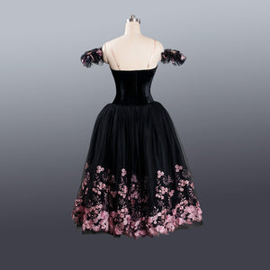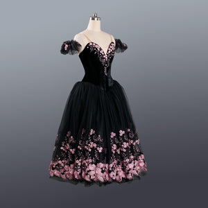 The romantic tutu skirt is made of black net and is richly embellished with pink flower appliques as the bodice.