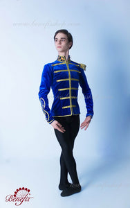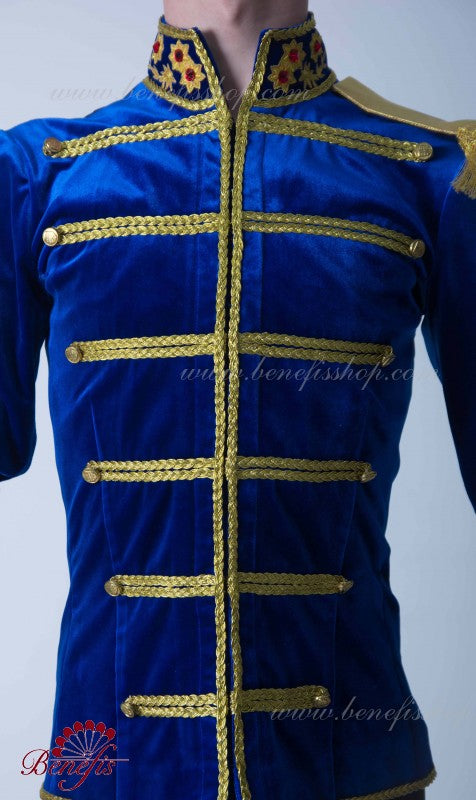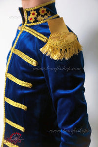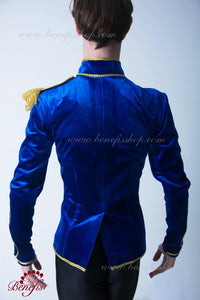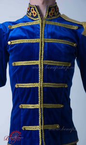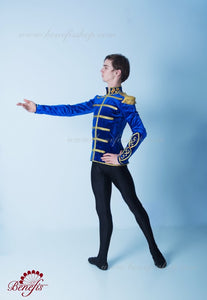 This is a professional stage costume made of semi-elastic velvet. Equipped with a stand-up collar. Fastened with hooks and loops on the front. Decorated with shiny braid and appliqués. The shoulders are decorated with epaulets. The costume can be made in any color at the request of the client.