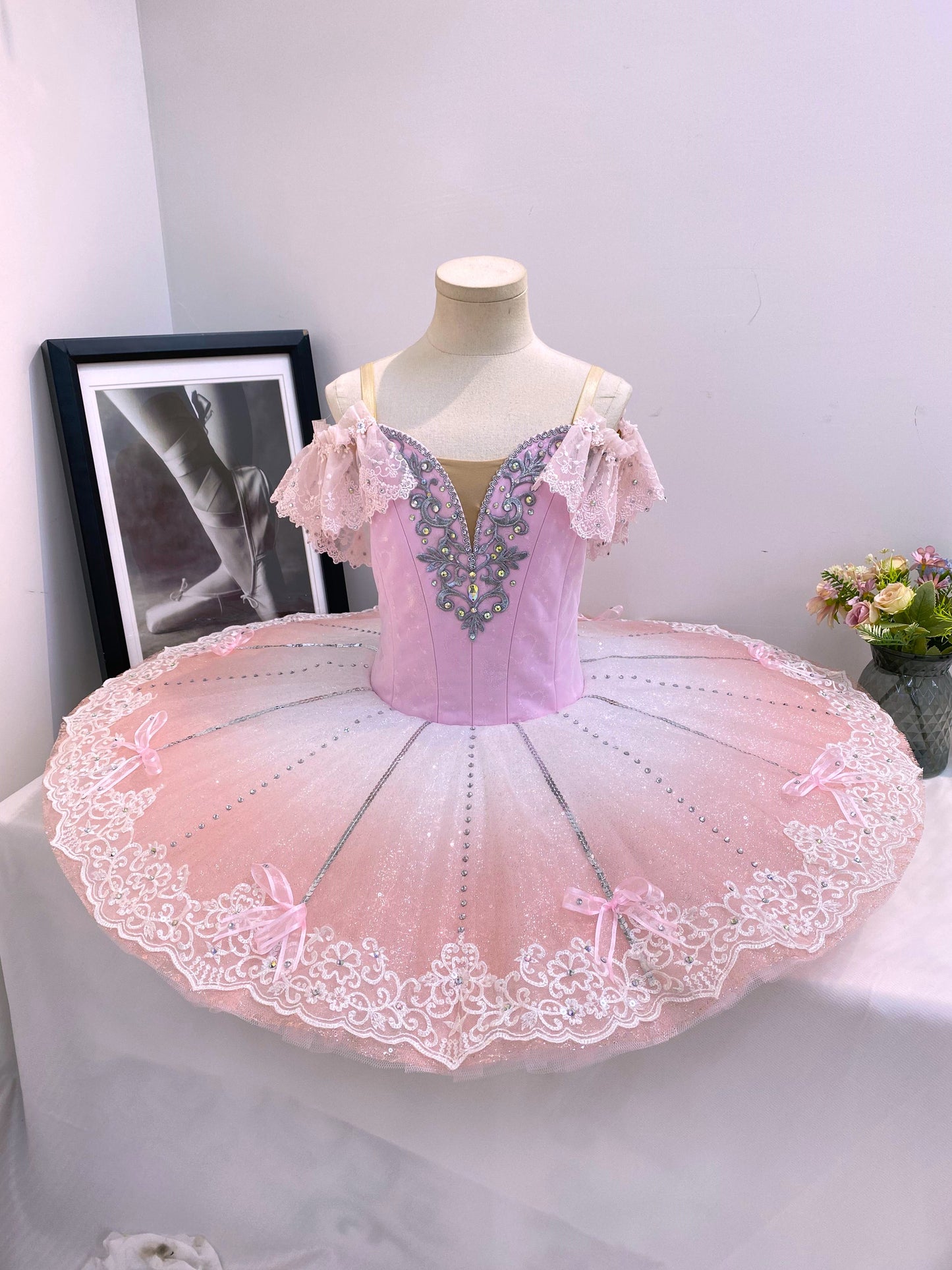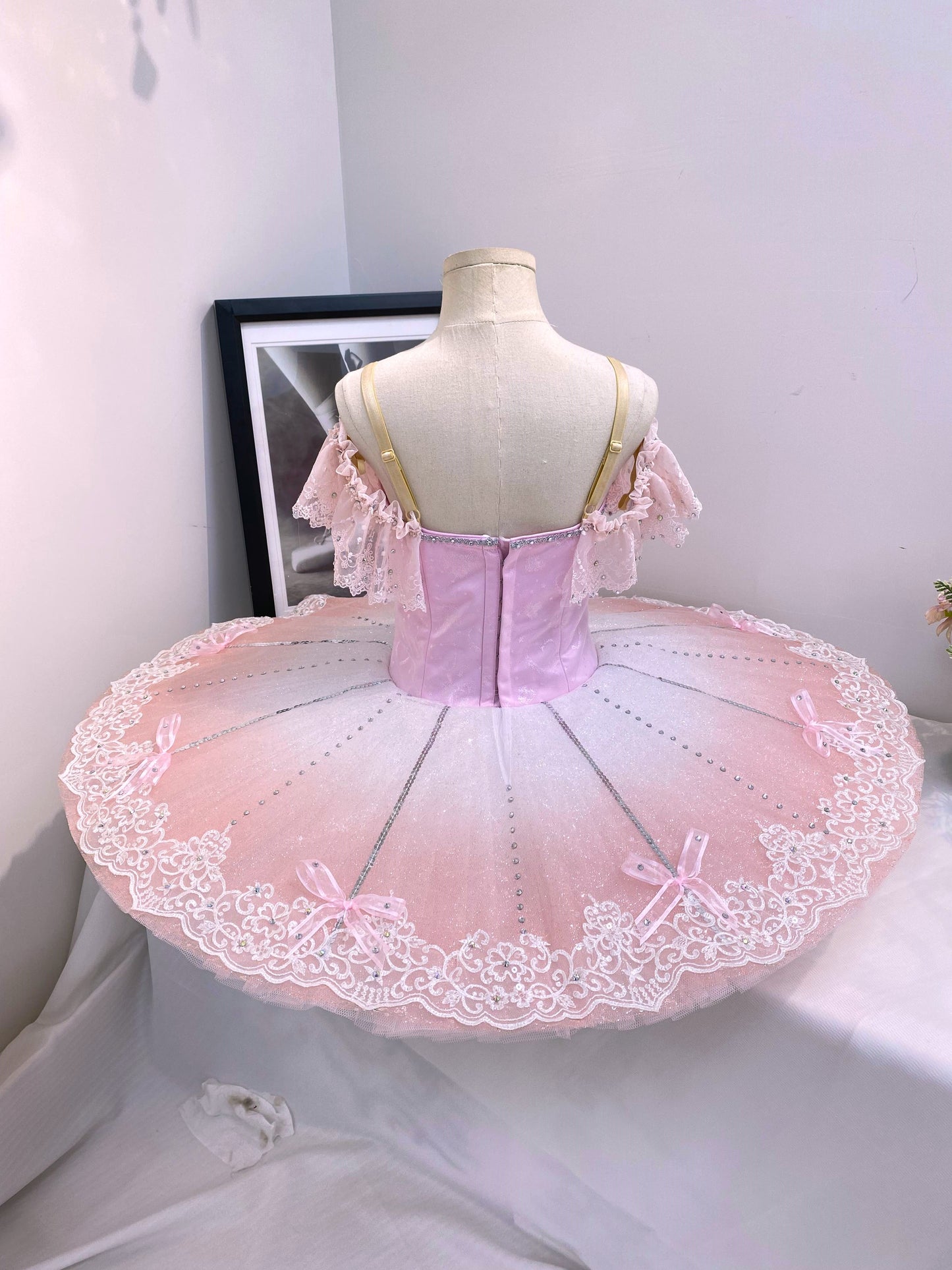 The professional 12 layers, pancake tutu skirt features a glittery, ombre' dyed pink overlay entirely decorated with silver sequins and trims, and pink bows.