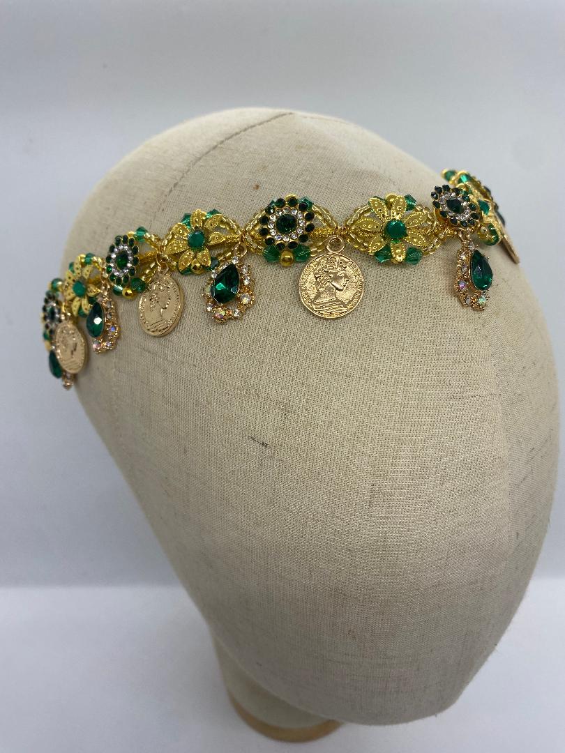 Built on a golden frame, this tiara features green stones, crystals, and golden coins in the gypsy style.